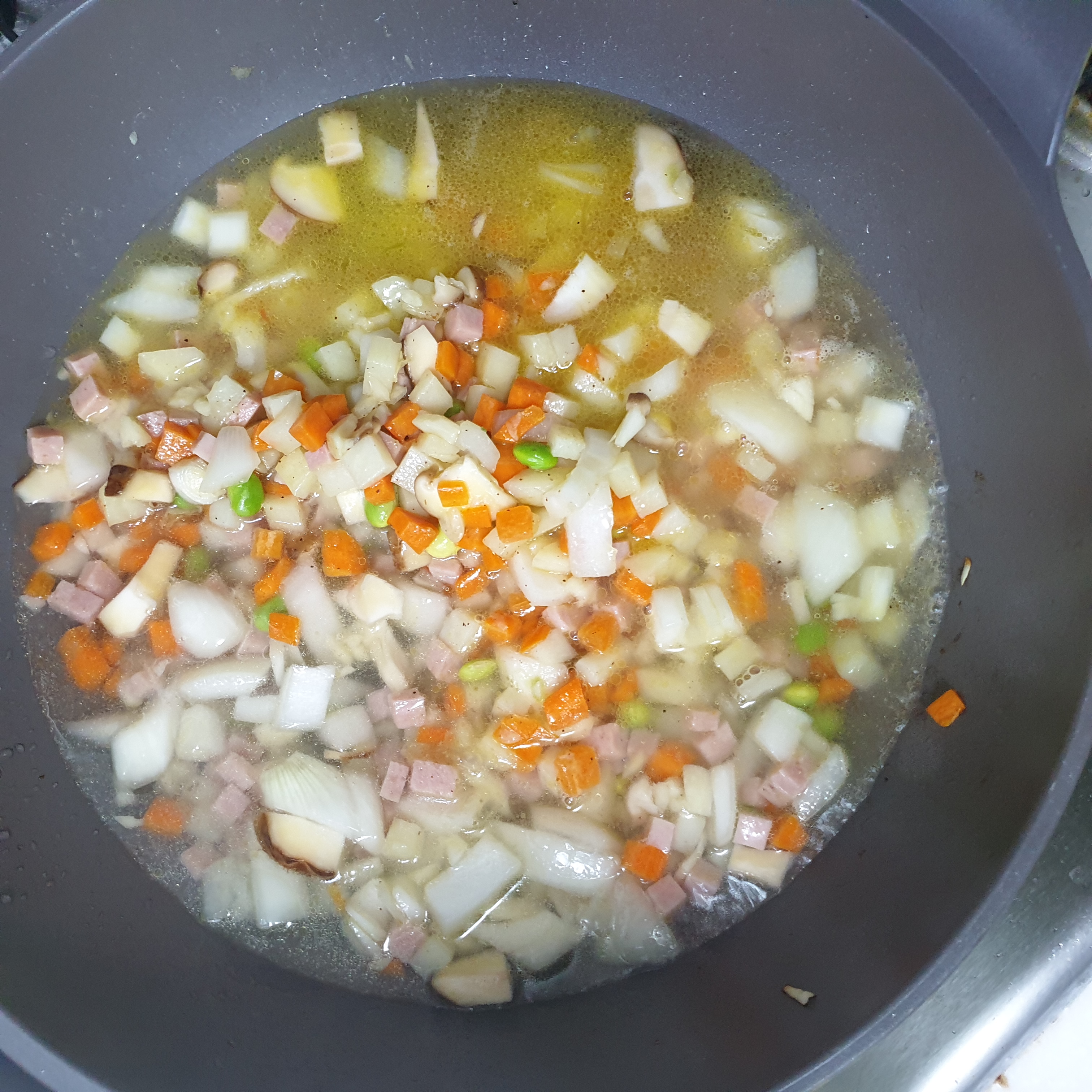 야채가 익어갈때쯤 햄과 표고버섯을 넣어줍니다 (저는 집에 있는 햄을 넣었습니다)