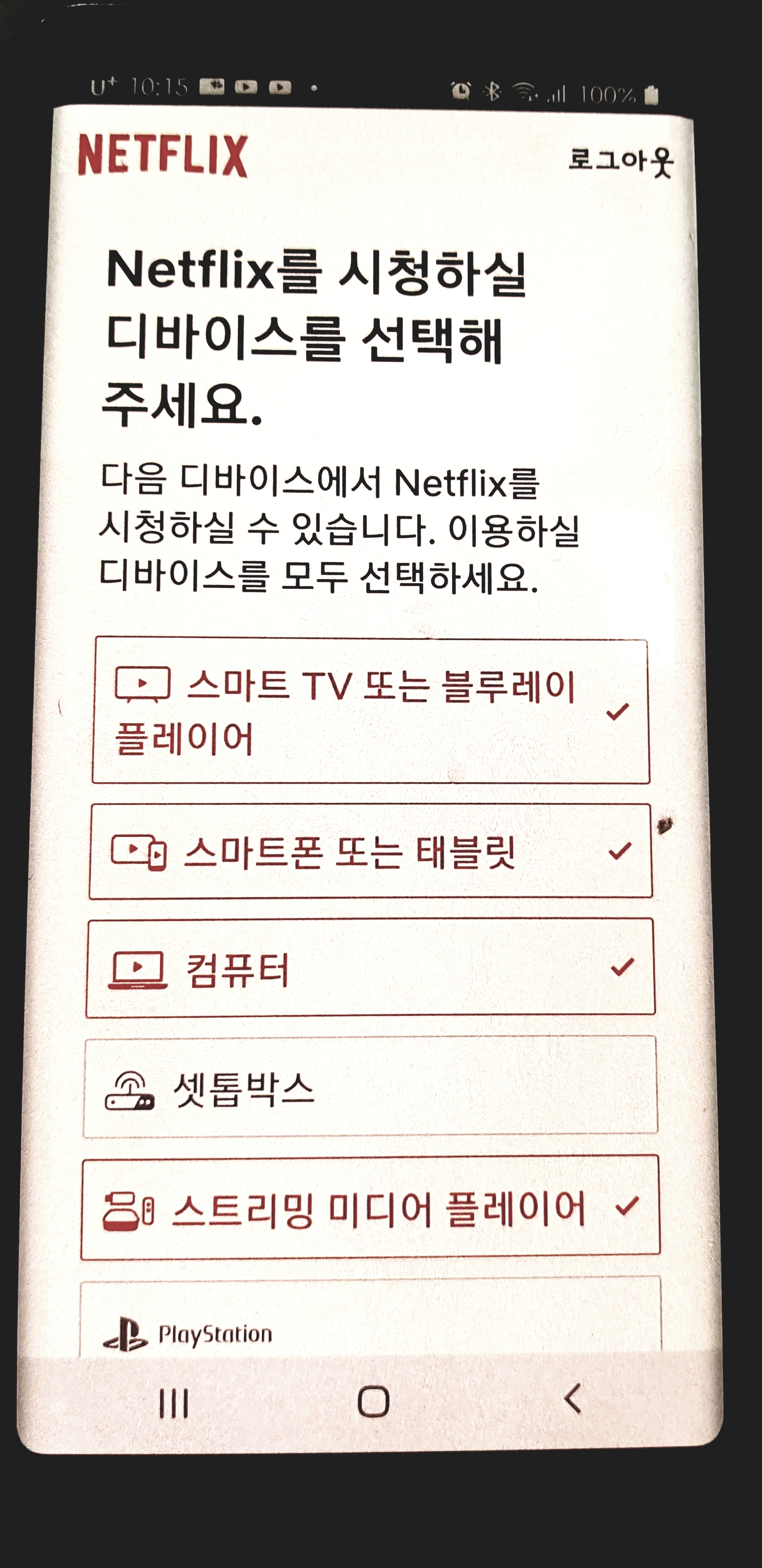 넷플릭스를 시청할 기기를 선택합니다 스마트폰 3대랑 태블릿1대 그리고 아이둘도 볼꺼라서 키즈두명도 체크 했습니다