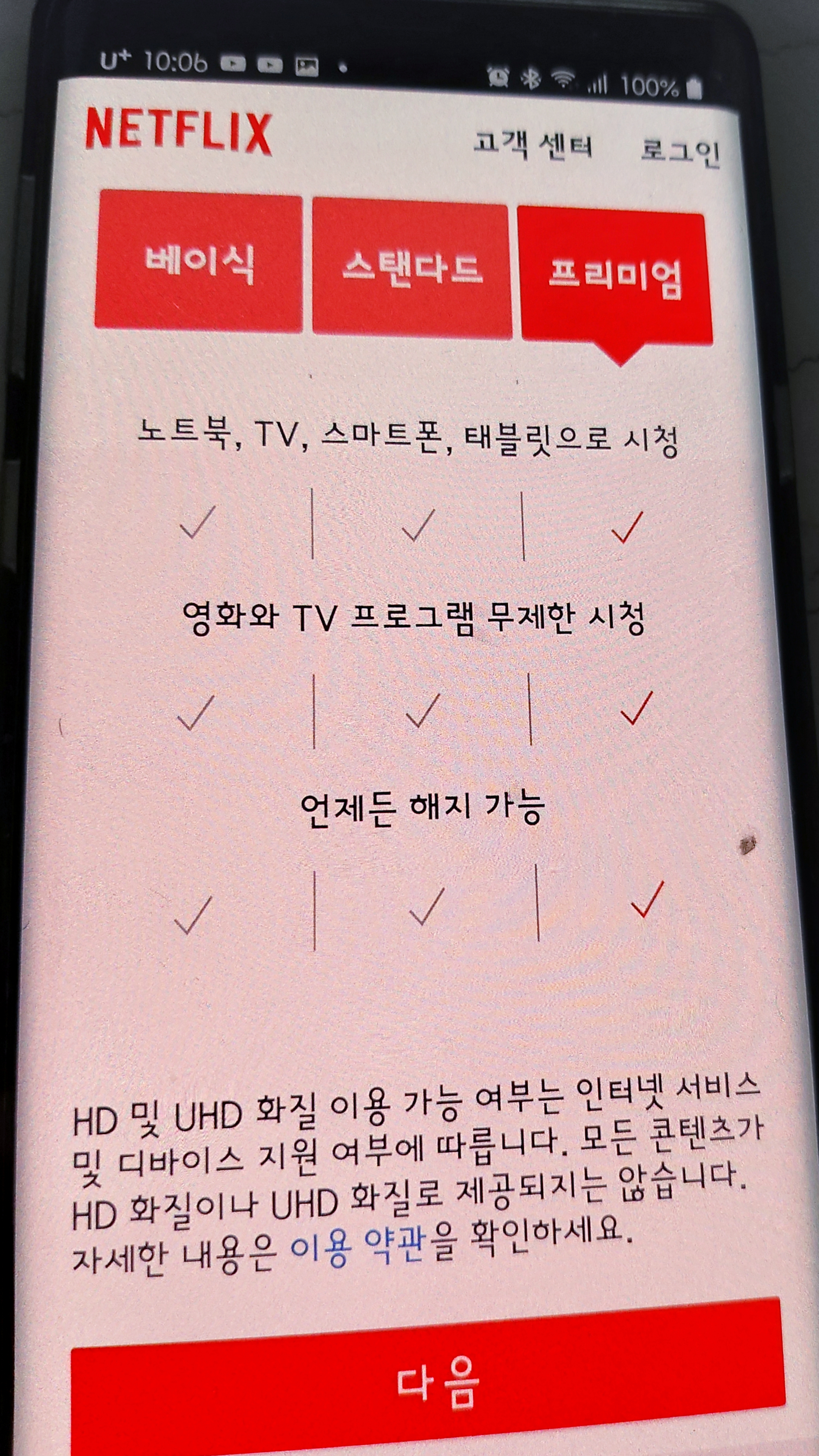 프리미엄은 한달요금 14,500원/ 동시 접속가능은 4명까지만 가능 / 화질 UHD 이용가능