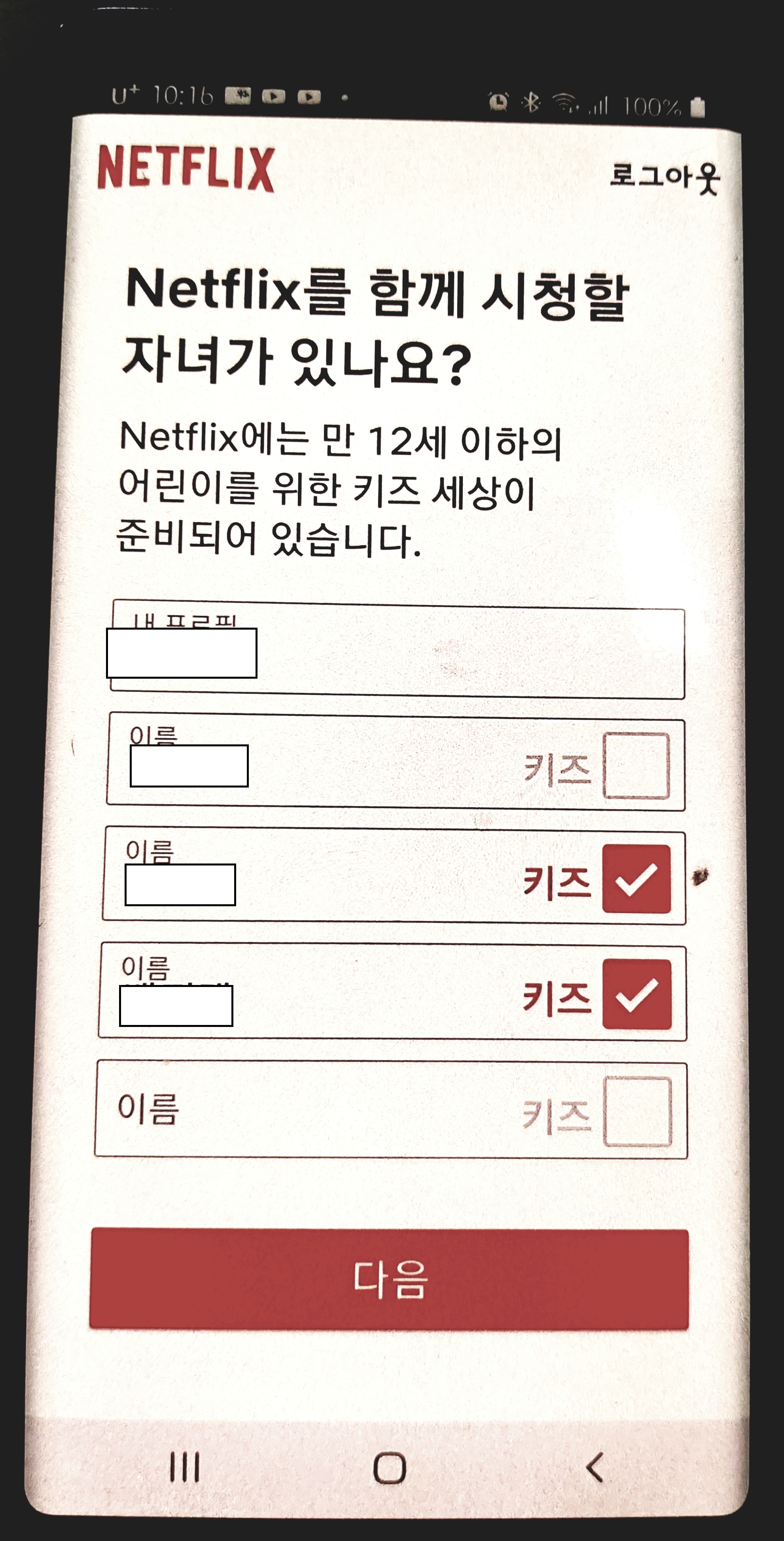 넷플릭스를 시청할 기기를 선택합니다 스마트폰 3대랑 태블릿1대 그리고 아이둘도 볼꺼라서 키즈두명도 체크 했습니다