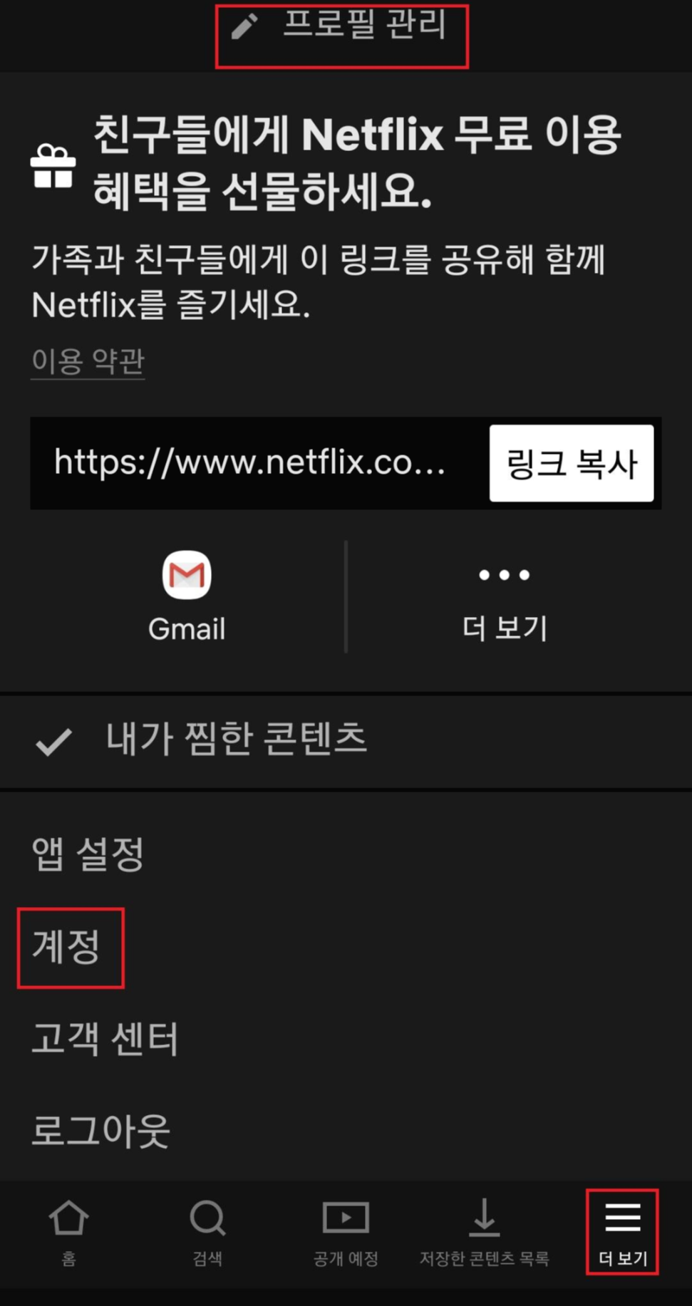 더보기를 누르면 프로필관리가 나옵니다 아래 계정으로 들어가 멥버십 해지를 누릅니다