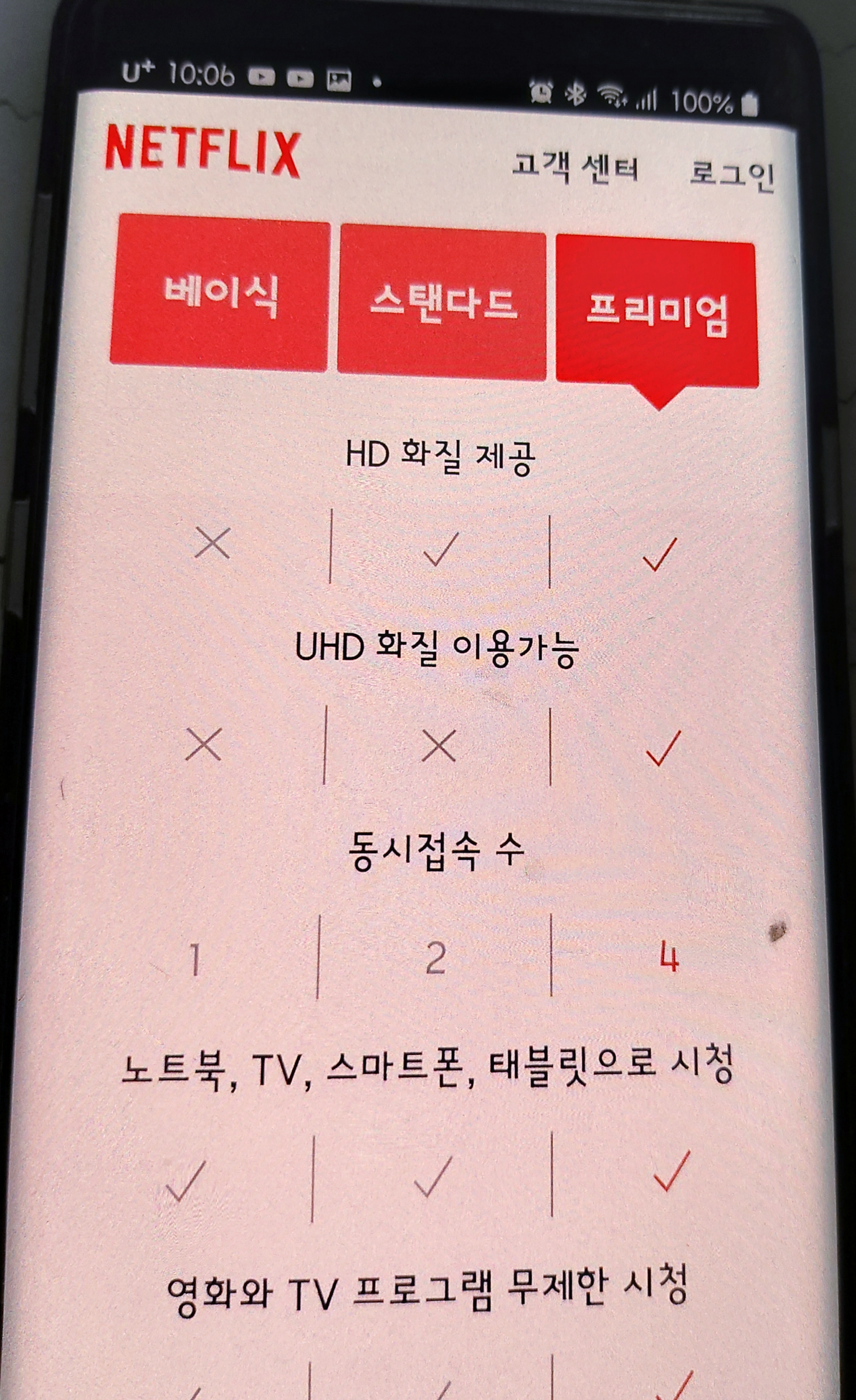 베이식은 한달요금 9,500원 /동시 접속은 1명만 가능/화질은 SD