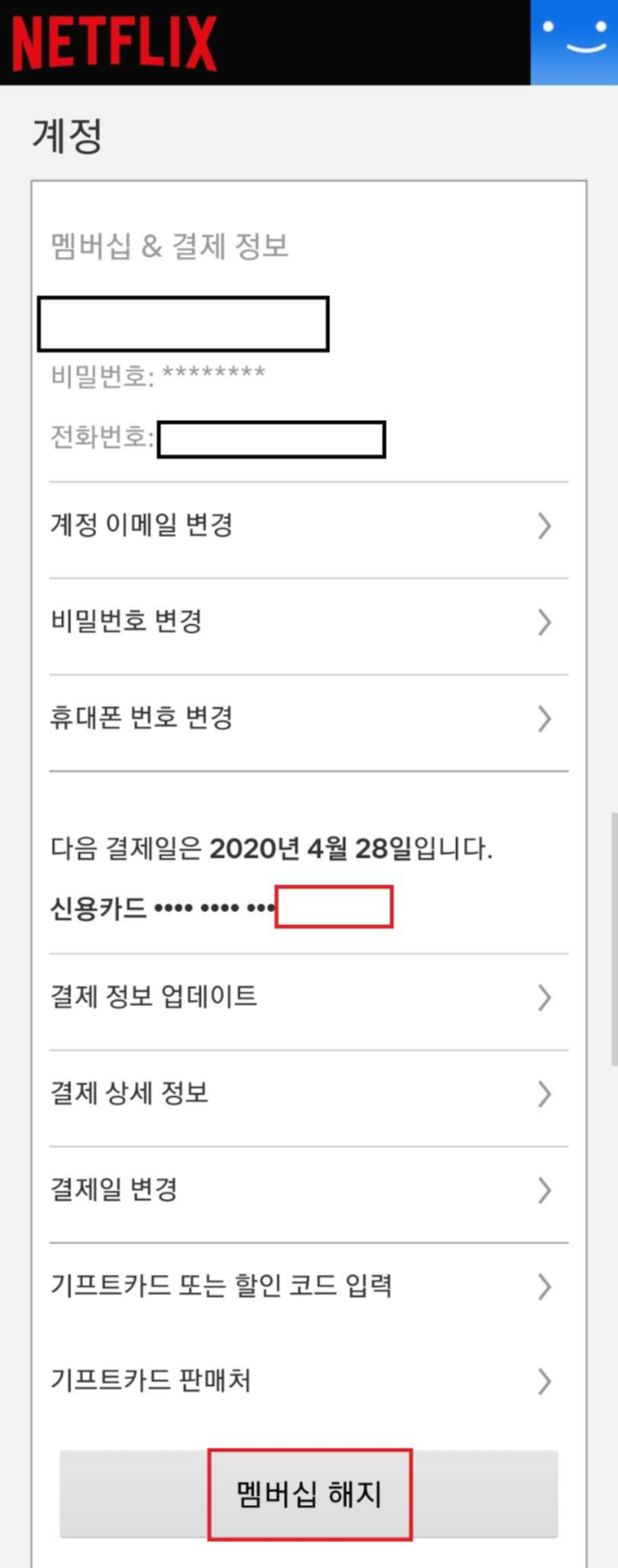 아래를 살펴보니 그대로 넷플릭스를 계속 볼지 말지 결정을 할수 있도록 한달정도 있다가 4월28일 에 해지가 된다고 나옵니다