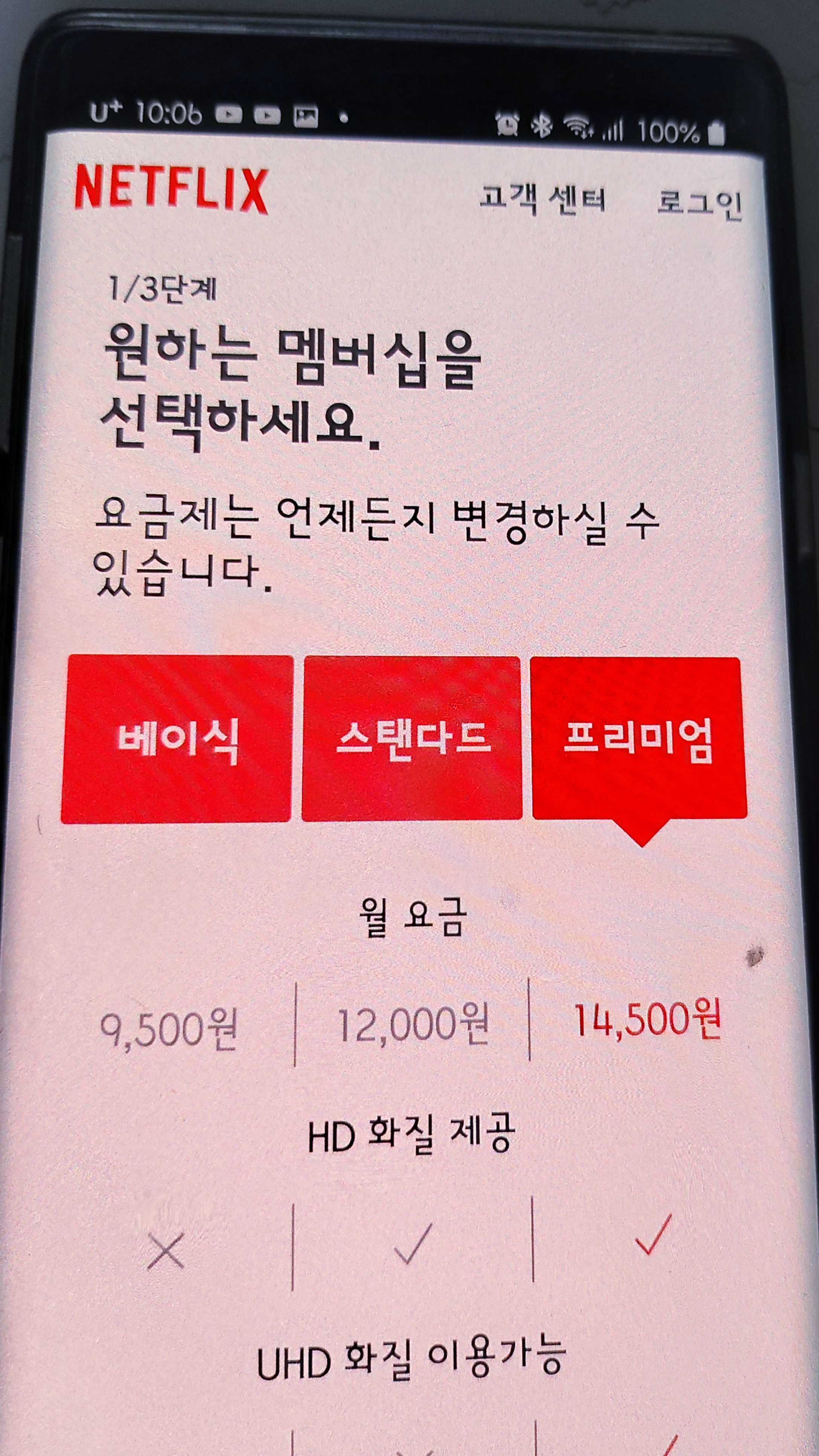프리미엄은 한달요금 14,500원/ 동시 접속가능은 4명까지만 가능 / 화질 UHD 이용가능