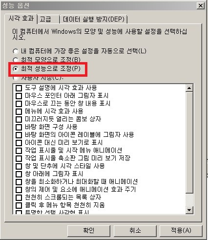 5.최적 성능으로 조정을 누르게 되면 아래 체크박에 체크되어진것이 다 사라집니다