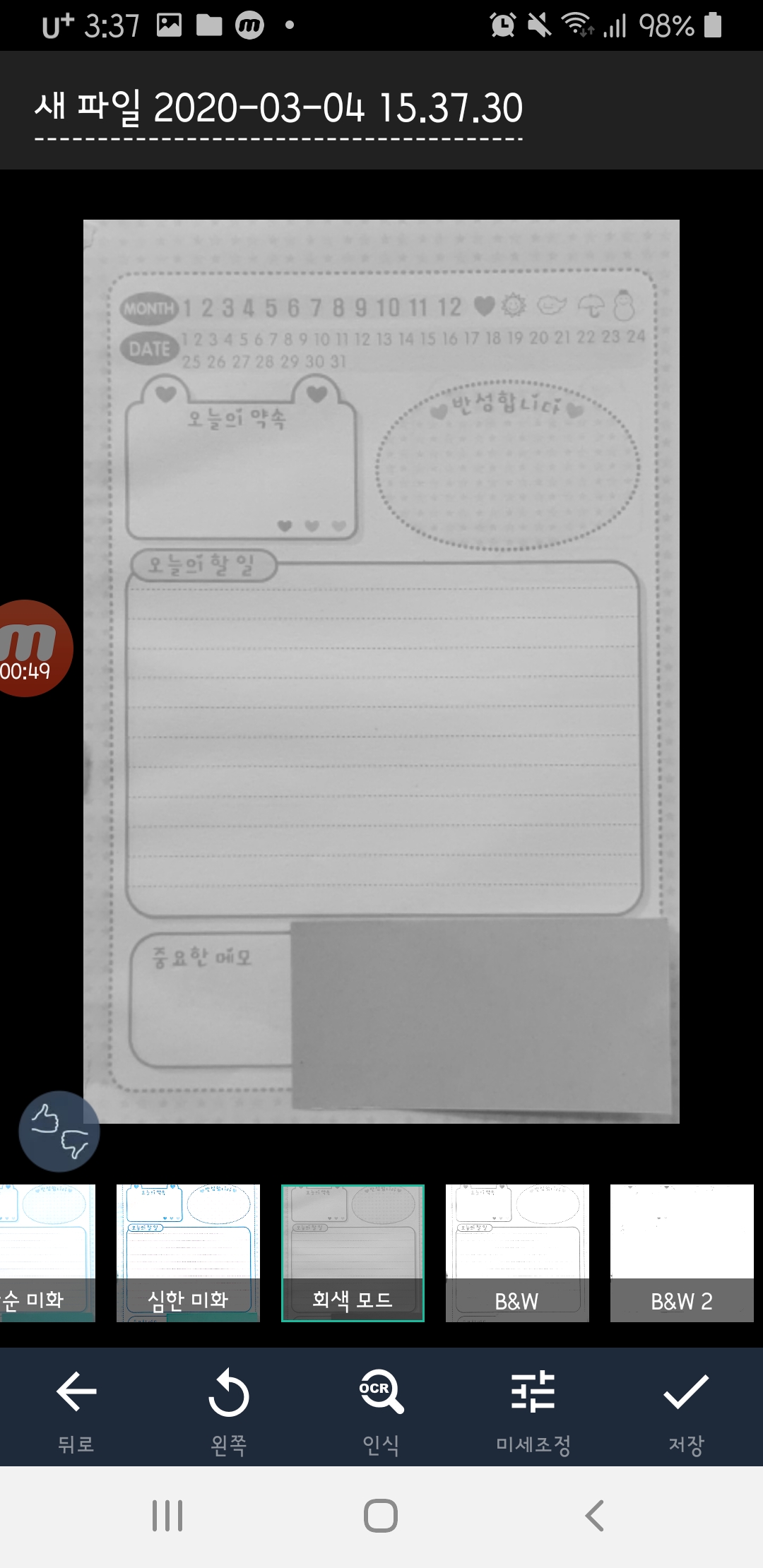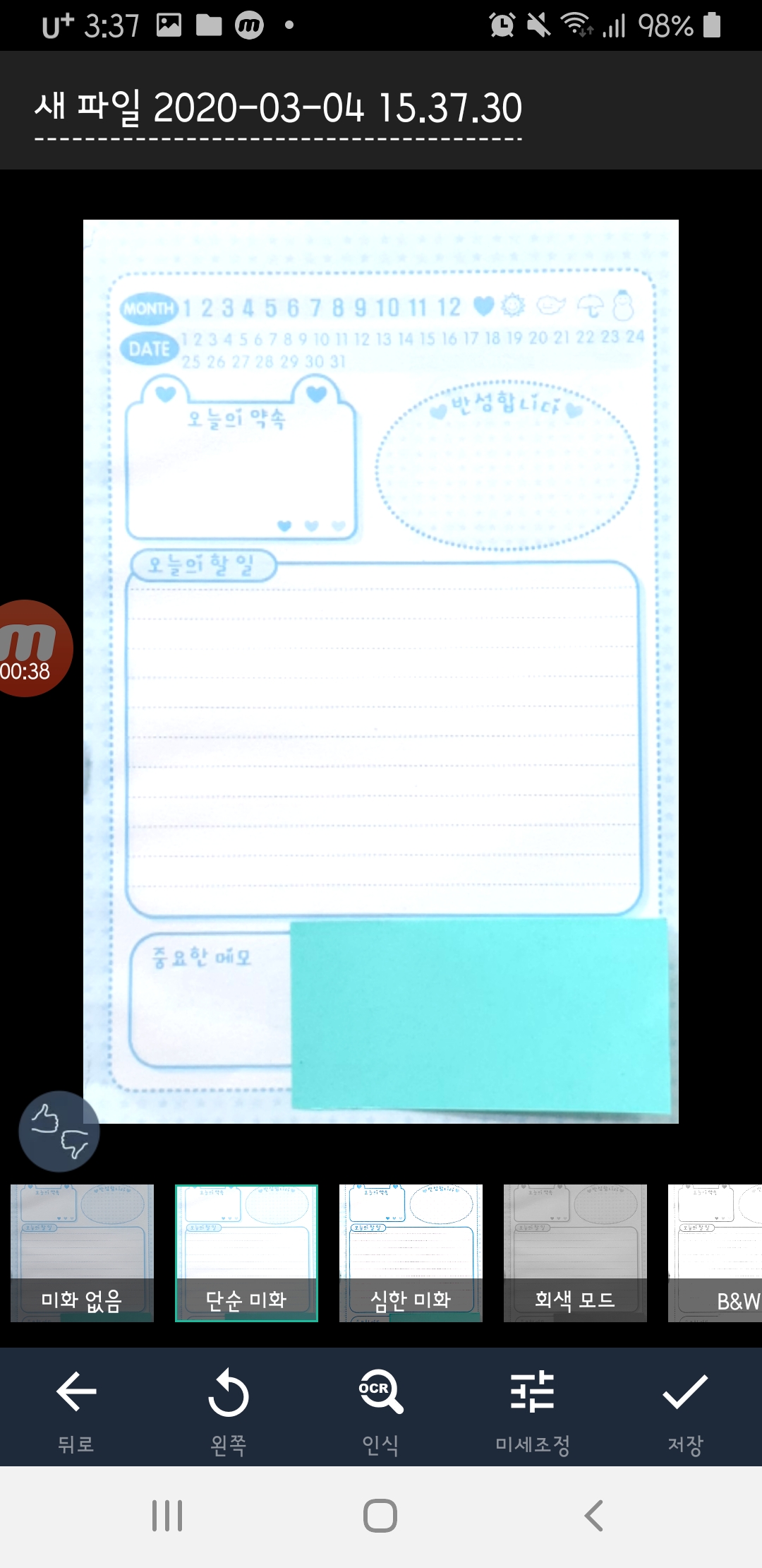 책뒤에 어두운배경이 있으면 촬영후 자동 기울기 보정이 가능해서 바로 딱 스캔을 할수가 있어요