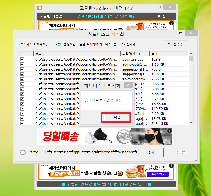 검사를 눌러주면 그동안 내컴퓨터에 필요없던 파일들이 쫙 나오게 됩니다 최적화를 위해 확인을 눌러주시면 완료됩니다.