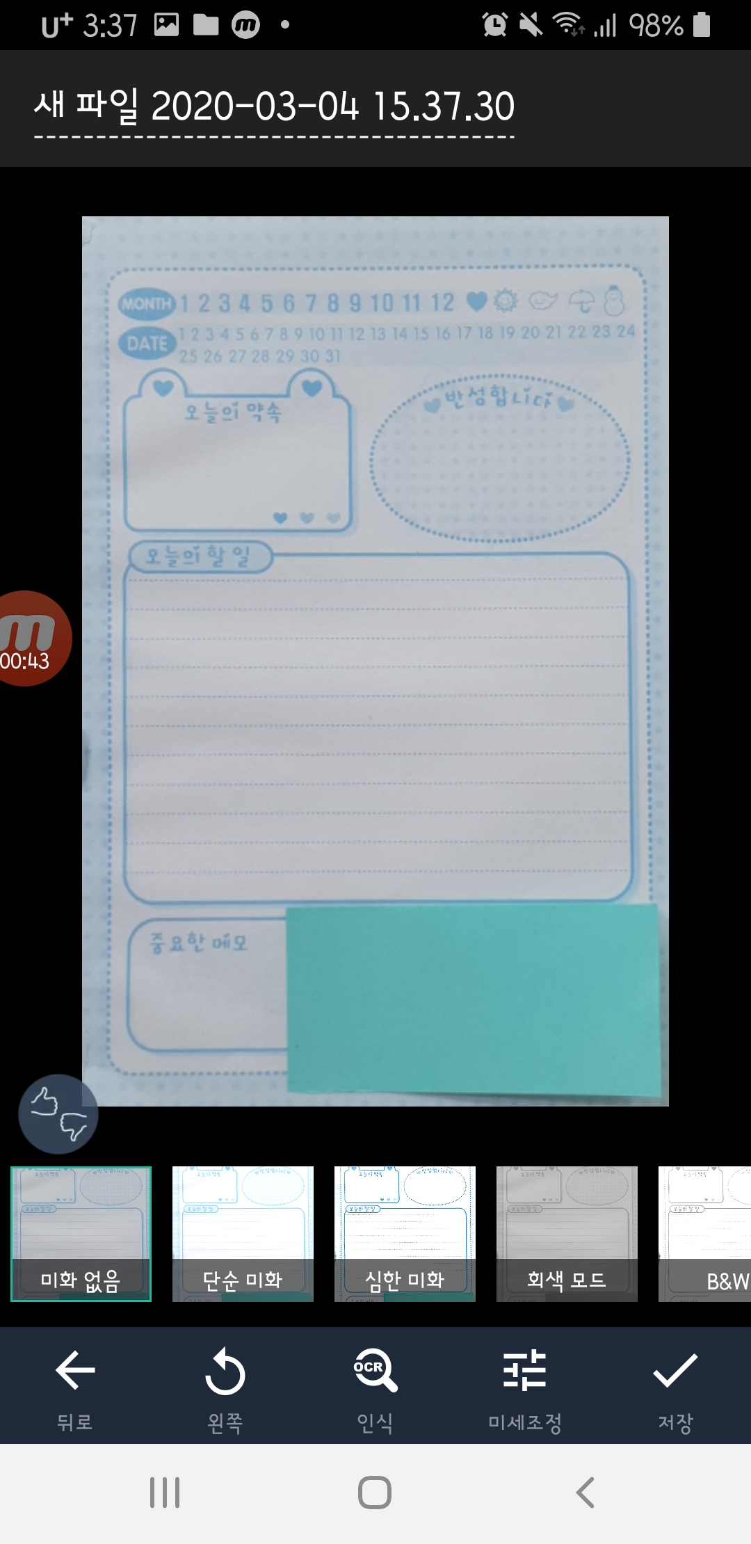 책뒤에 어두운배경이 있으면 촬영후 자동 기울기 보정이 가능해서 바로 딱 스캔을 할수가 있어요