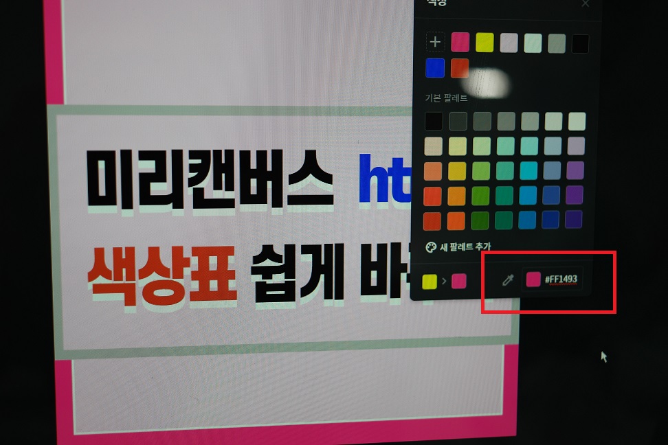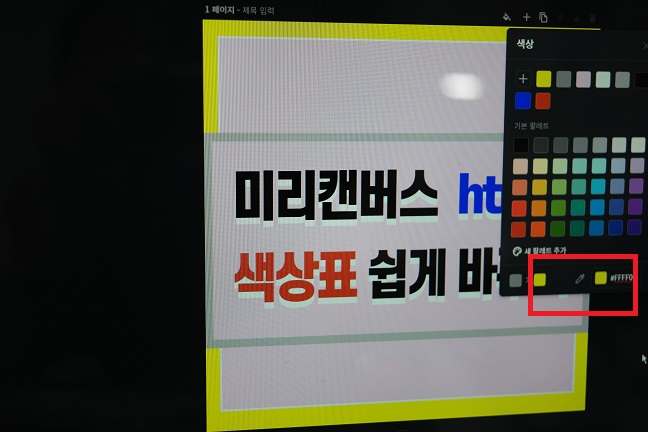 그럴때는 미리캔버스 프로그램을 열은 다음 옆에는 색상코드 컬러차트를 같이 열어놓고 원하는 색상을 눌러 코드를 복사해서 넣어주면 쉽게 변경이 가능해서 저는 이방법을 쓰고 있답니다.